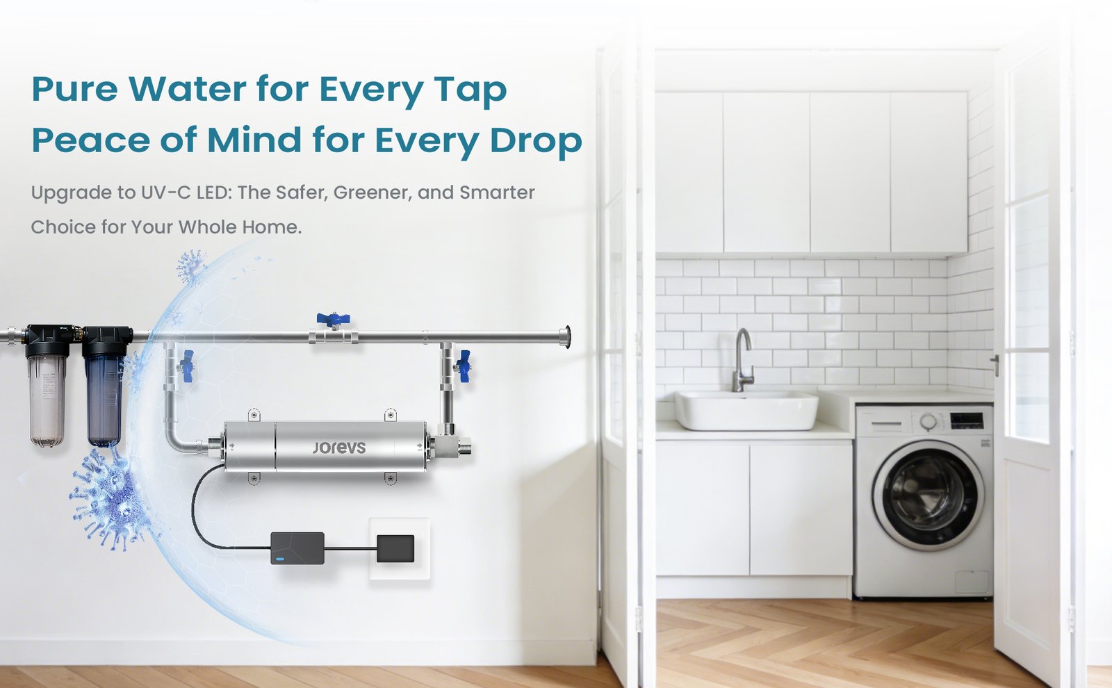 A centralized high‑flow UVC LED disinfection system installed at the main inlet provides continuous microbiological protection across the entire household.