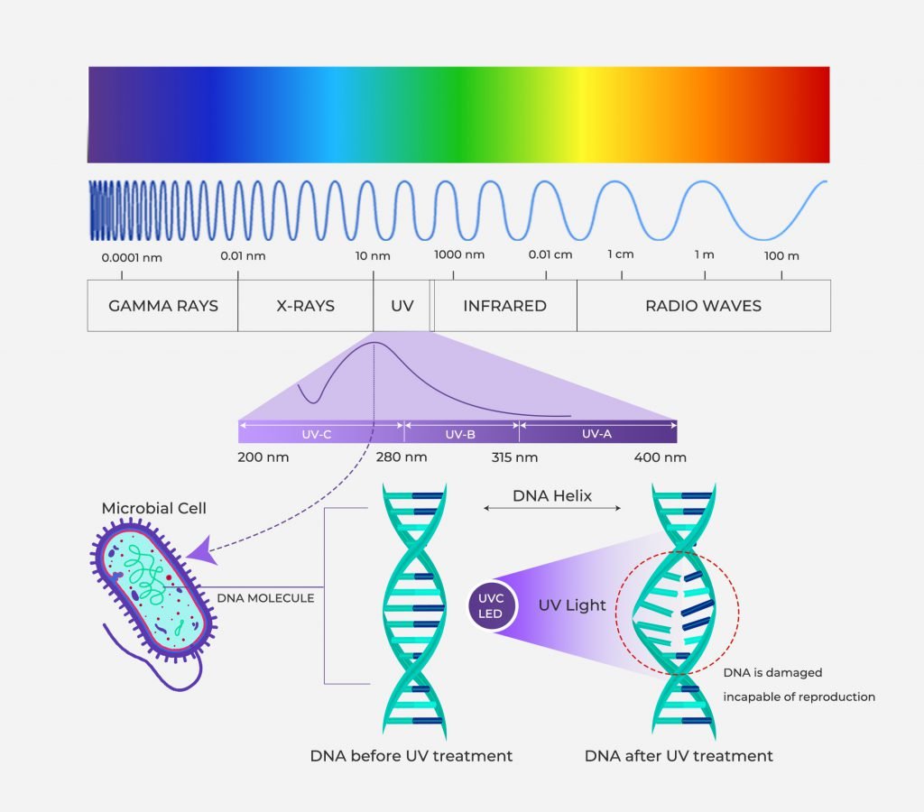 UVC irradiation induces the formation of dimers between adjacent thymines on the DNA chain, directly hindering the normal replication and transcription of DNA, leading to microbial inactivation. It is a physical sterilization method without chemical residues.